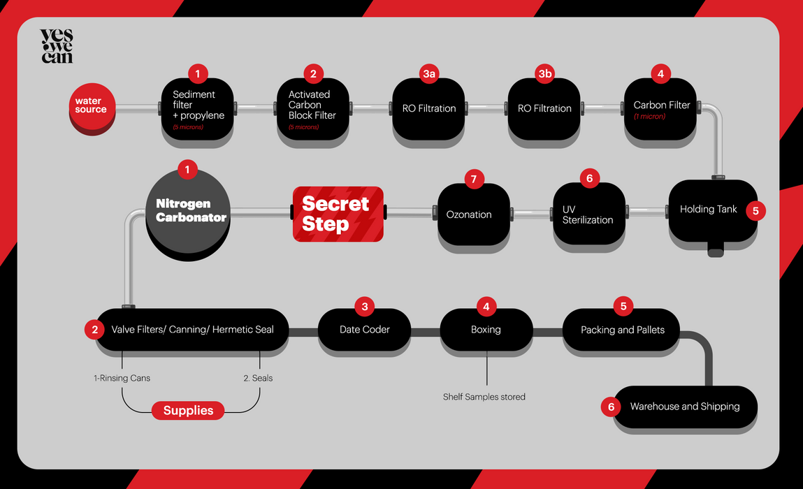 At Yes We Can Drinks, we employ world-class systems and machinery to create sterile water that maintains its freshness and purity for decades. The integrity of our emergency water's purity and sterility is of utmost importance to us. This commitment drives our meticulous water filtration and canning process, guaranteeing that each can of water adheres to the most stringent standards. Our dedication to innovation and enhancement fuels ongoing improvements in both our products and procedures, allowing us to tirelessly strive for accessibility and affordability of our emergency canned water for all.