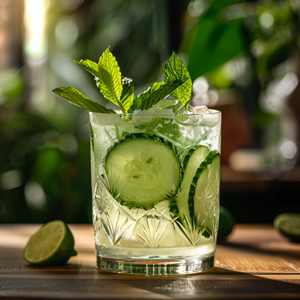 Muddle cucumber and lime juice in a glass. Fill with ice. Top with Mint Infused Water and soda water. Stir gently.