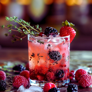In a glass, muddle a few berries. Add lemonade and fill with ice. Top with Thyme Infused Water and soda water.